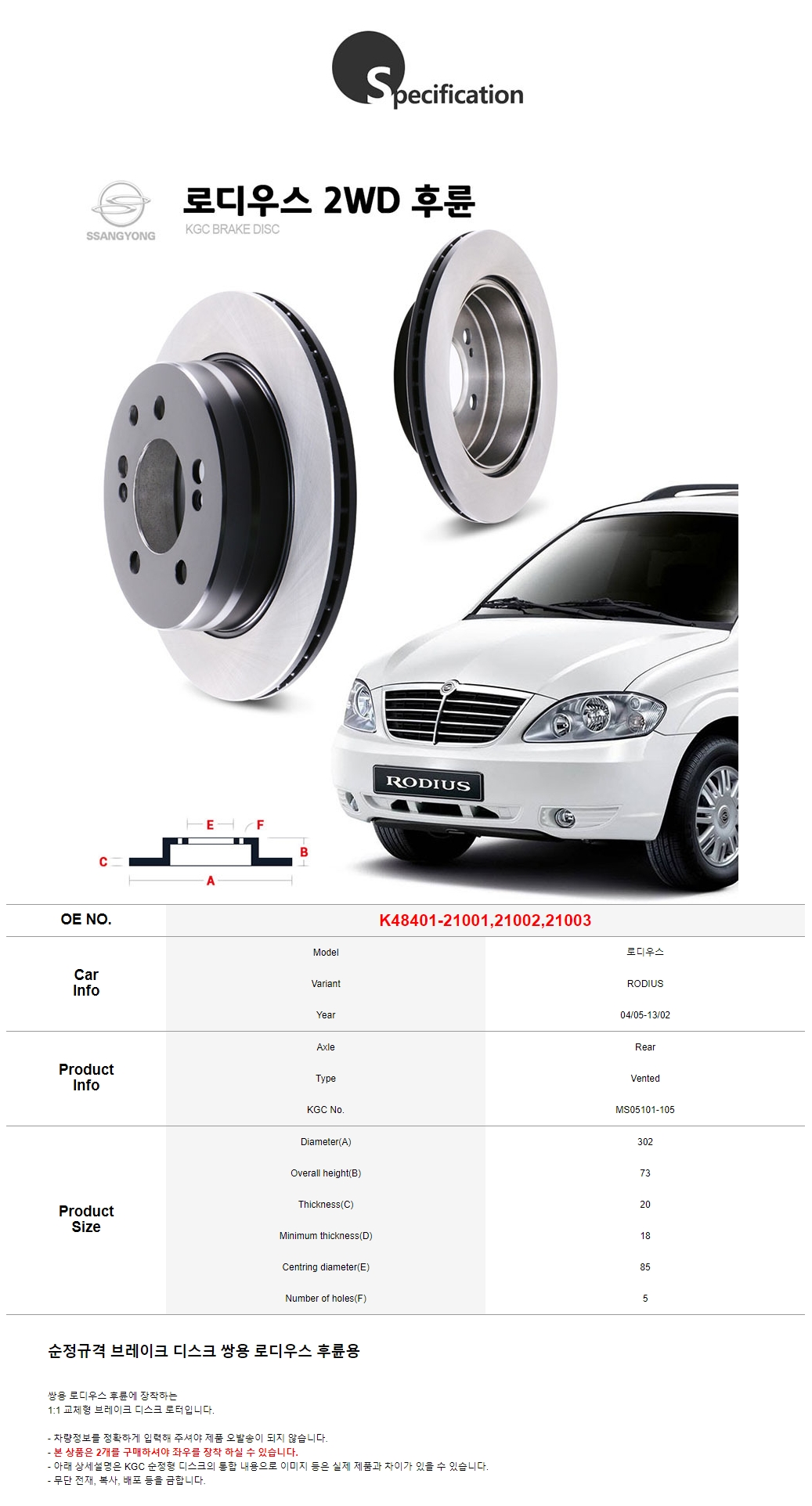 KGC 브레이크 순정형 로디우스 2WD 후륜 디스크 로터 K48401-21001