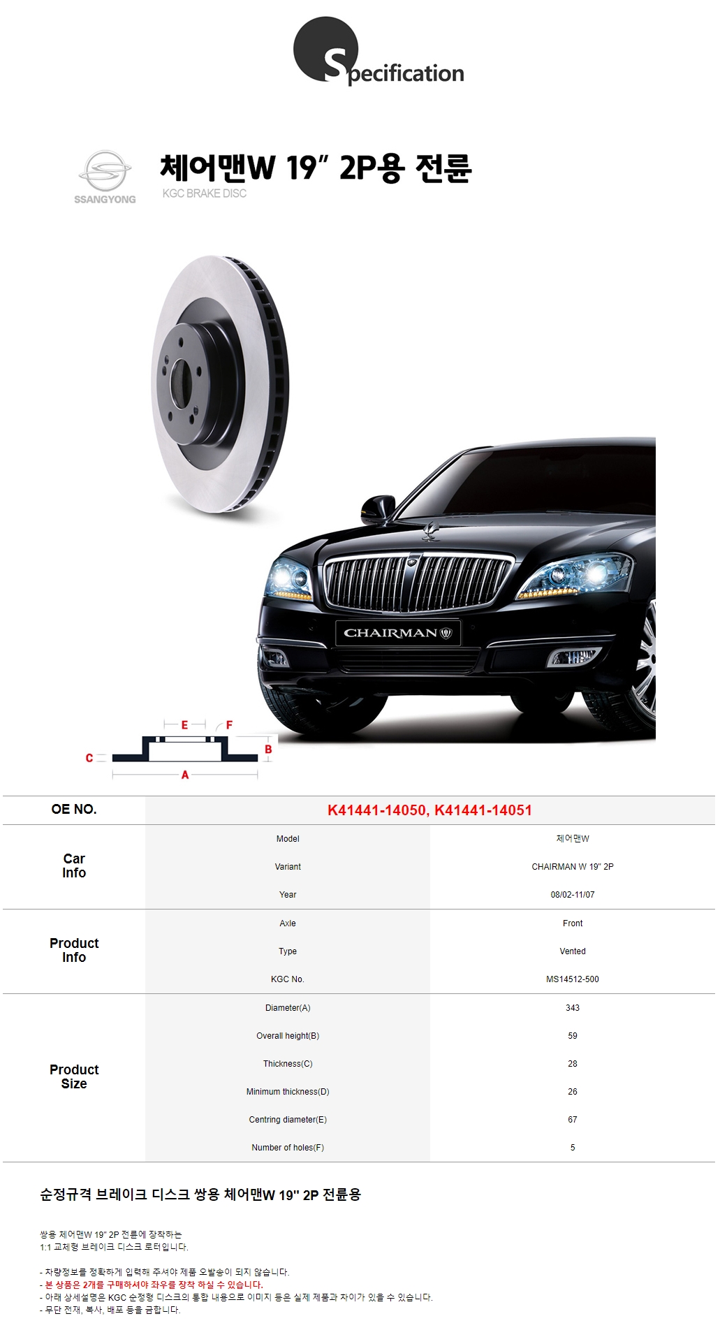 KGC브레이크 체어맨W 19인치 2P 전륜 순정형 디스크로터 K41441-14050