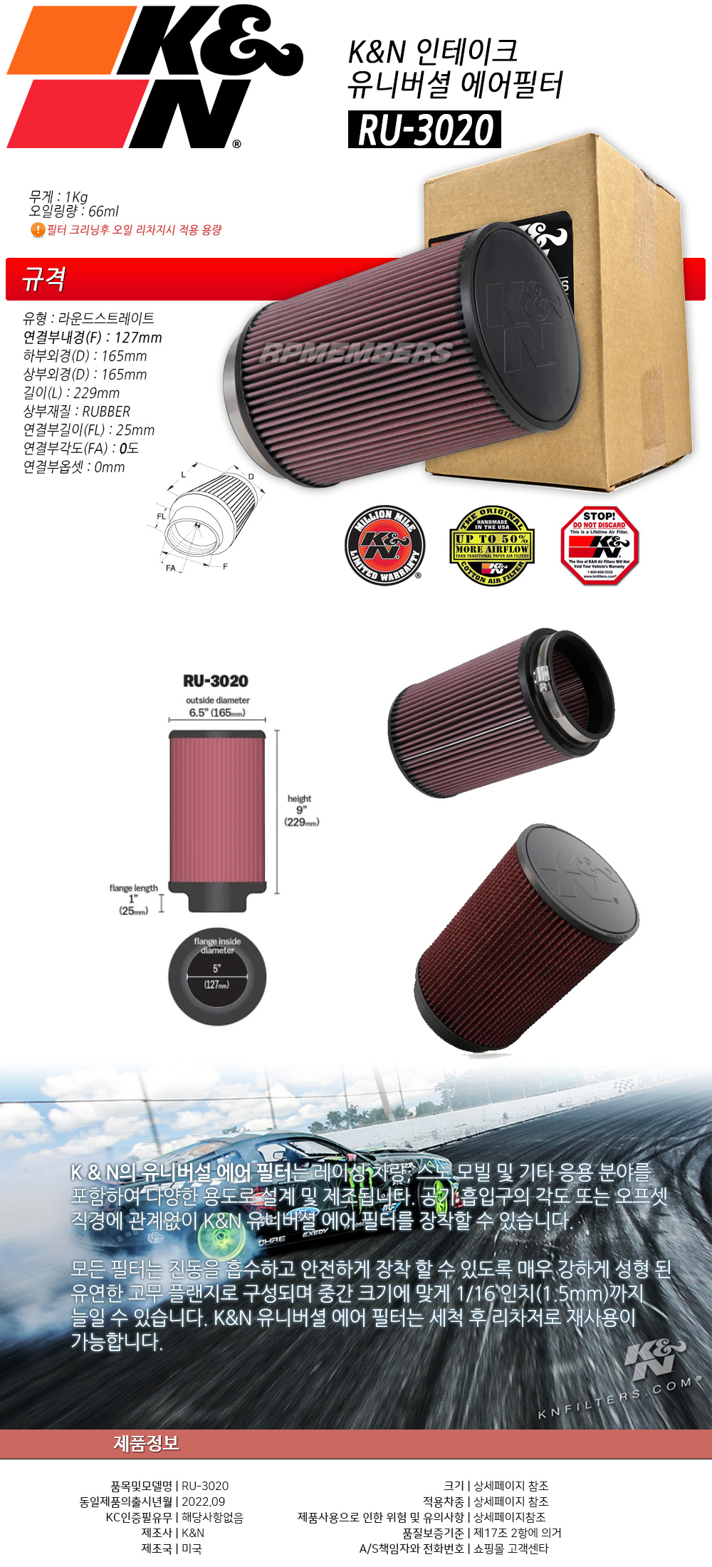 K&N RU-3020 127mm 에어 인테이크용 오픈형 튜닝 필터 라운드 스트레이트형