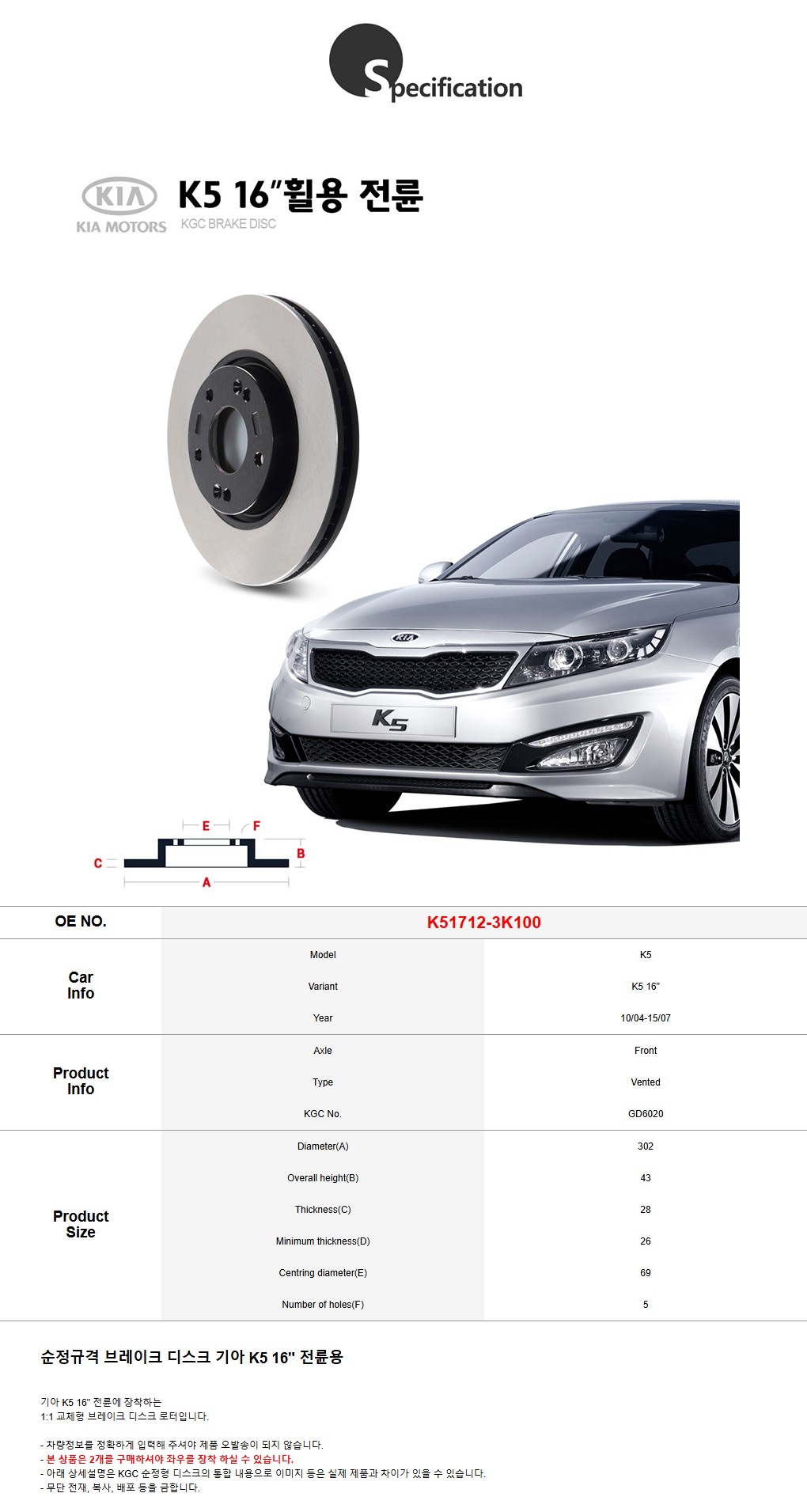 KGC브레이크 기아 K5 16인치 전륜 순정형 디스크 로터 K51712-3K100